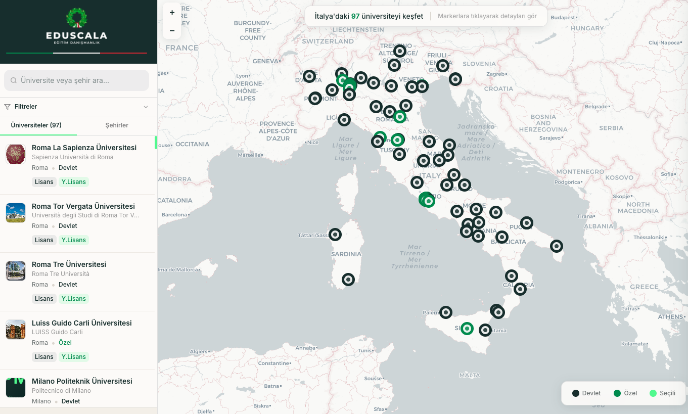 EduScala Üniversite Gezgini, İtalya’daki üniversiteleri interaktif harita sistemi üzerinden keşfetme imkanı sunan yenilikçi bir platformdur. Bu sistem sayesinde öğrenciler yalnızca üniversiteleri görmekle kalmaz, aynı zamanda eğitim planlarını daha stratejik oluşturabilir.